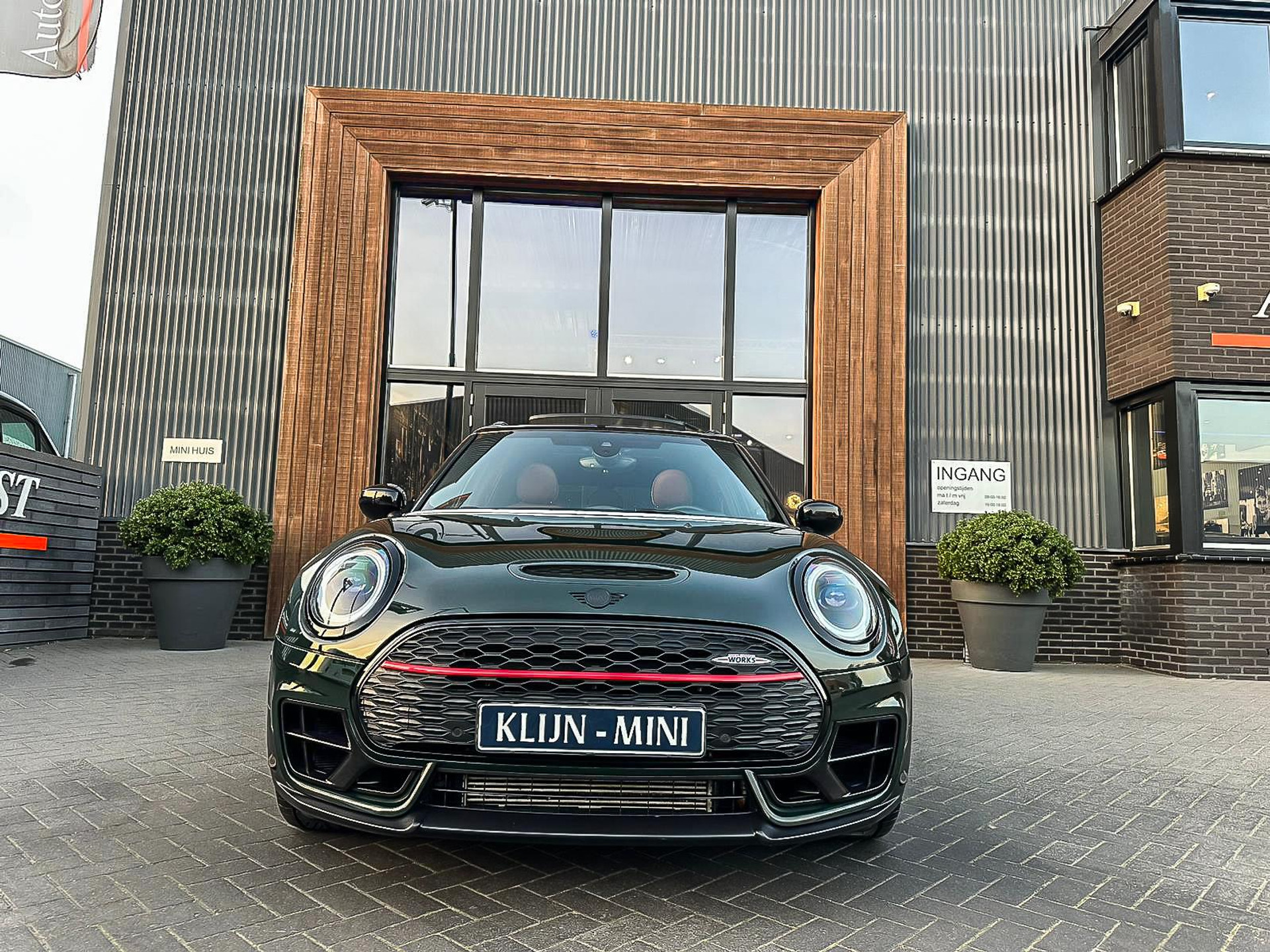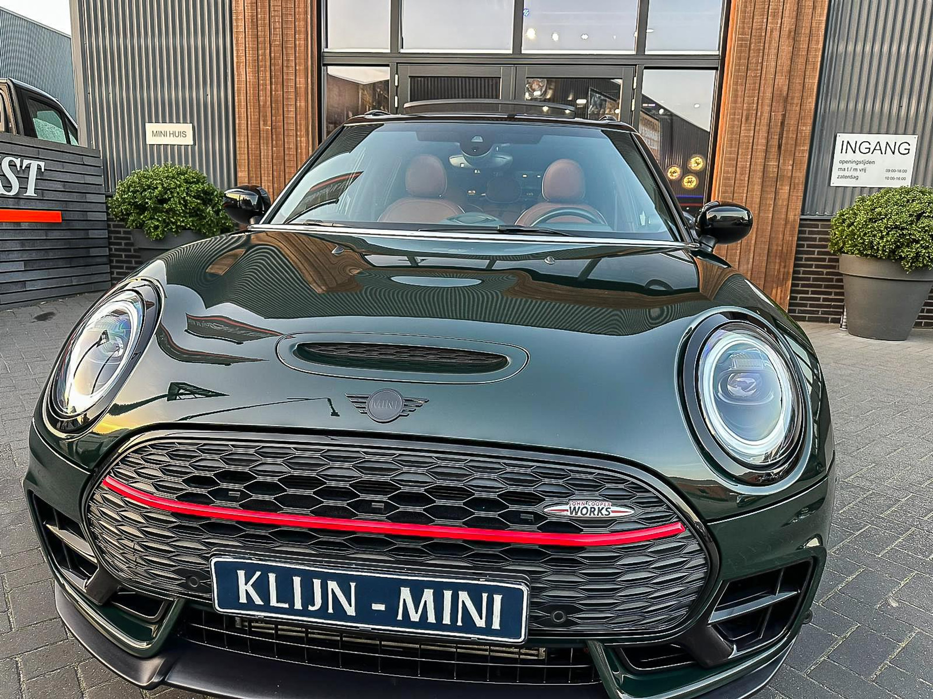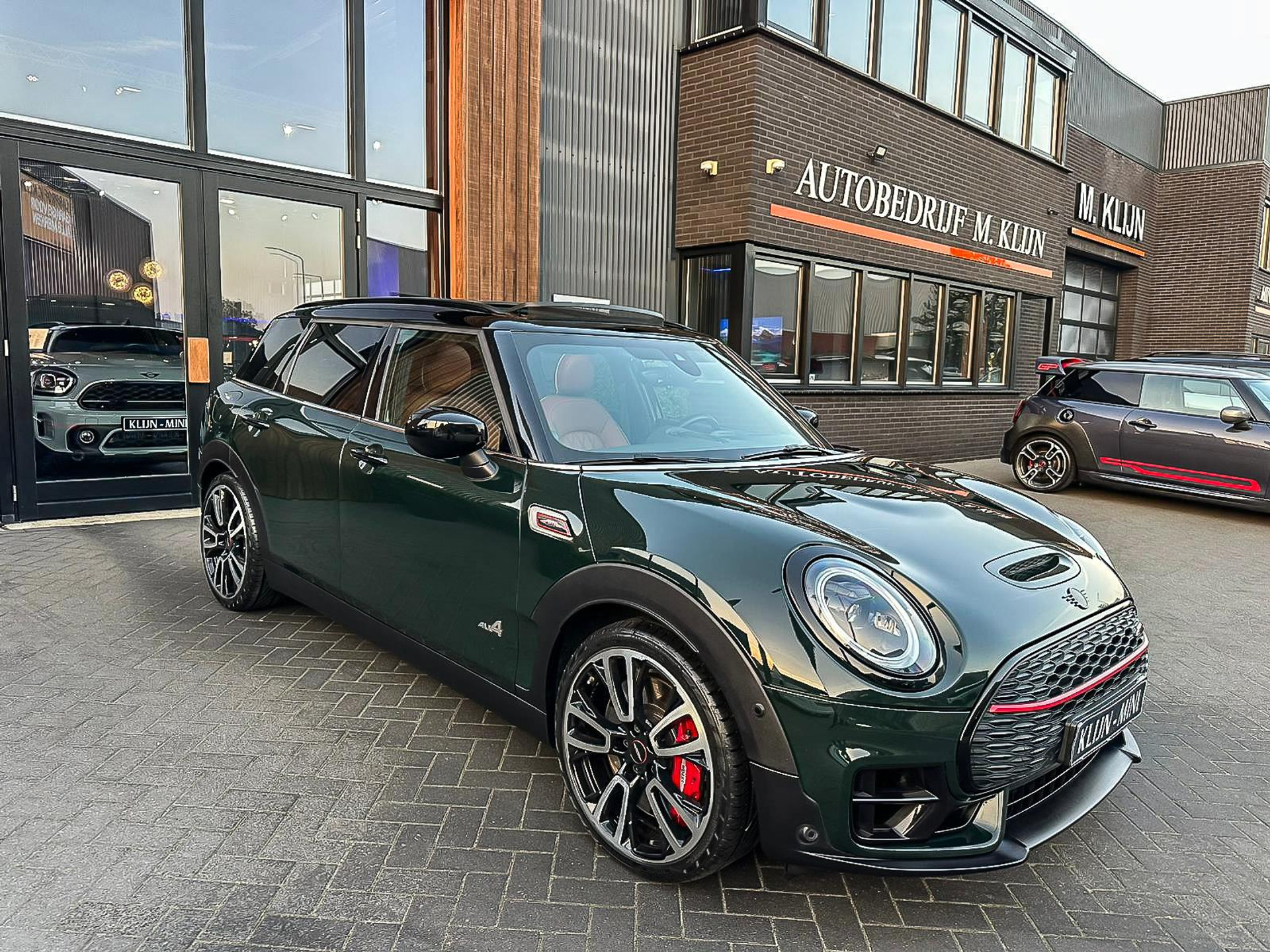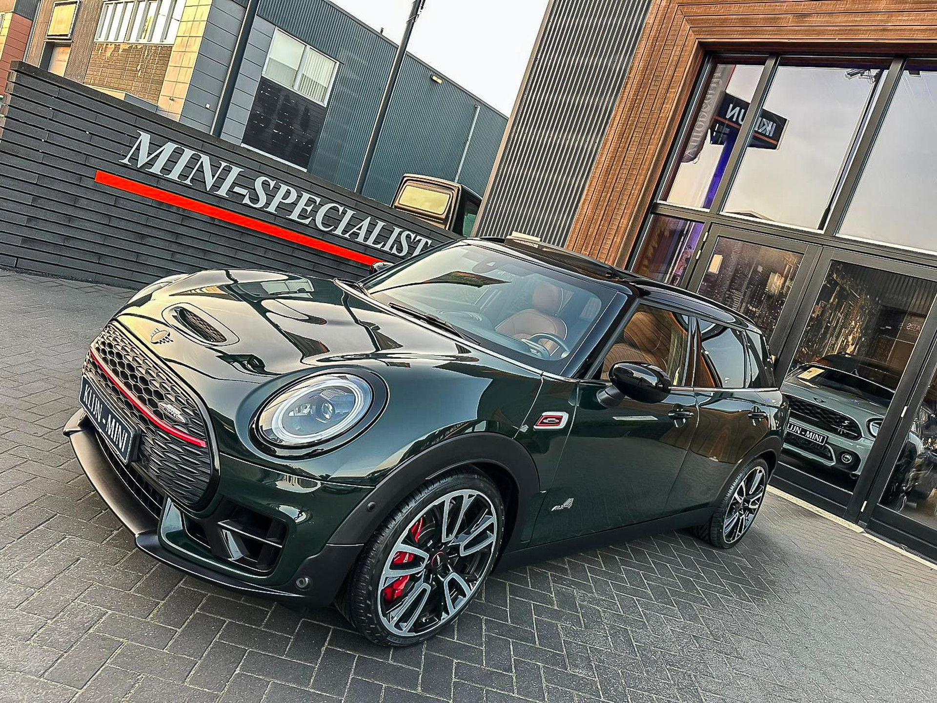 Zeer exclusieve facelift Mini Clubman John Cooper Works ALL4 F1 sportautomaat met een 306pk motor uitgevoerd in de prachtige kleurencombinatie van Rebelgreen en Chestermaltbrown lederen interieur.Deze in werkelijk nieuwstaat verkerende Mini is uitgerust met alle maar dan ook alle denkbare opties oa:Climate control,vollederen interieur Chestermalt brown,sportstoelen, stoelverwarming,verwarmd stuurwiel,virtual cockpit,breedbeeld dvd navigatie XL,Mini Connected XL,Harman Kardon soundsystem,adaptieve cruise control,keyless go,achteruitrijcamera,19” Jcw spoke velgen,head up display,sportpakket,vierwielaandrijving,led verlichting,elektrisch bedienbare glazen panoramadak,5 persoons,privacyglass,lederen Jcw sportstuur met F1 flipperschakel,lichtpakket met Mini logo's,welcome pakket,parkeersensoren voor en achter,parkassist(auto parkeert zelf in),F1 schakel op stuur,actieve voetgangersbeveiliging,dakrailing zwart,lc scherm,virtual cockpit,Mini driving modus,donker dakhemel,dakrailing zwart,mf stuur,Apple Carplay,dab radio,boordcomputer,blackline,regensensor,verwarmde voorruit,Union Jack achterlichten,vierwielaandrijving,armsteun,chili 2 pakket,alle boekjes+originele sleutels,1e eigenaar,48.000km origineel,nieuwprijs 72.500,-.Schitterende en unieke Mini Clubman Works in concoursstaat voor de echte liefhebber