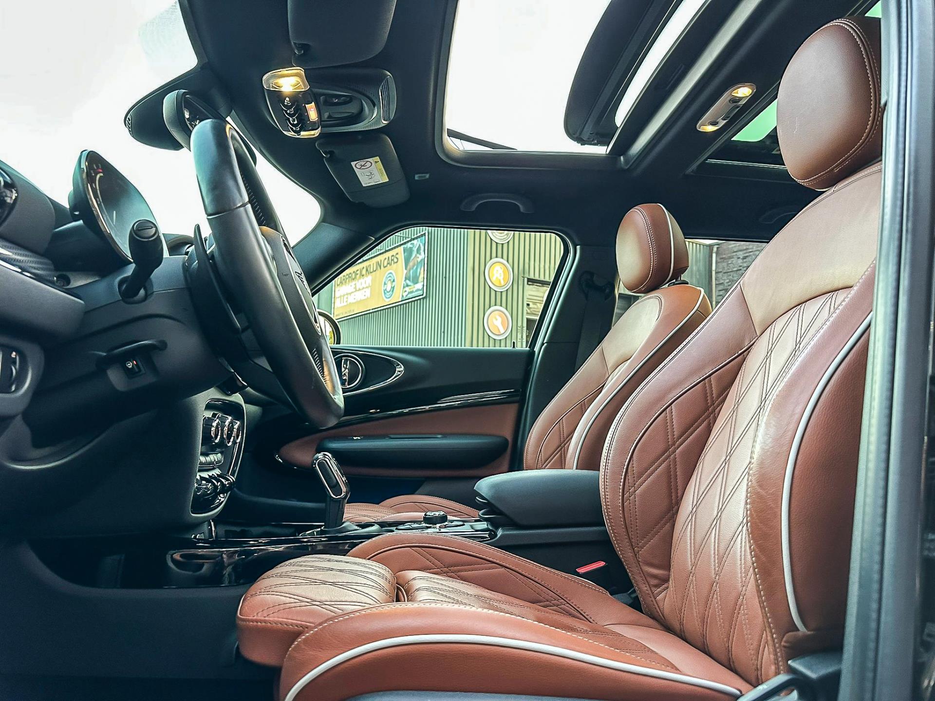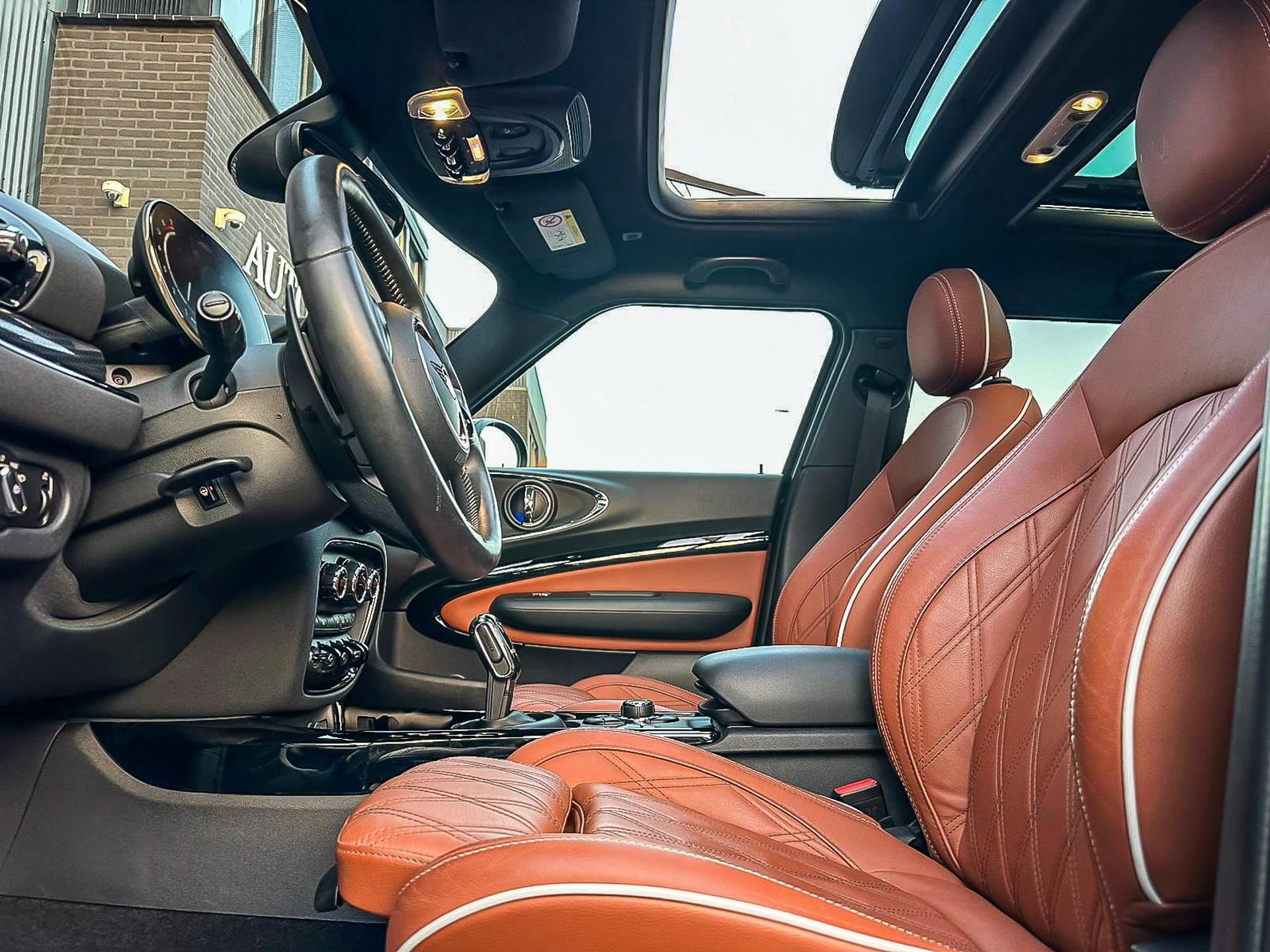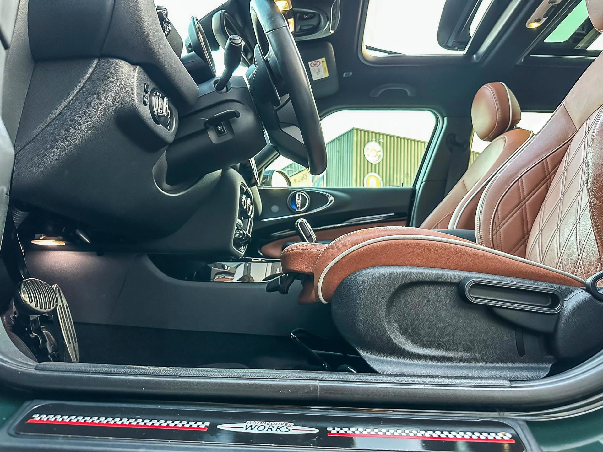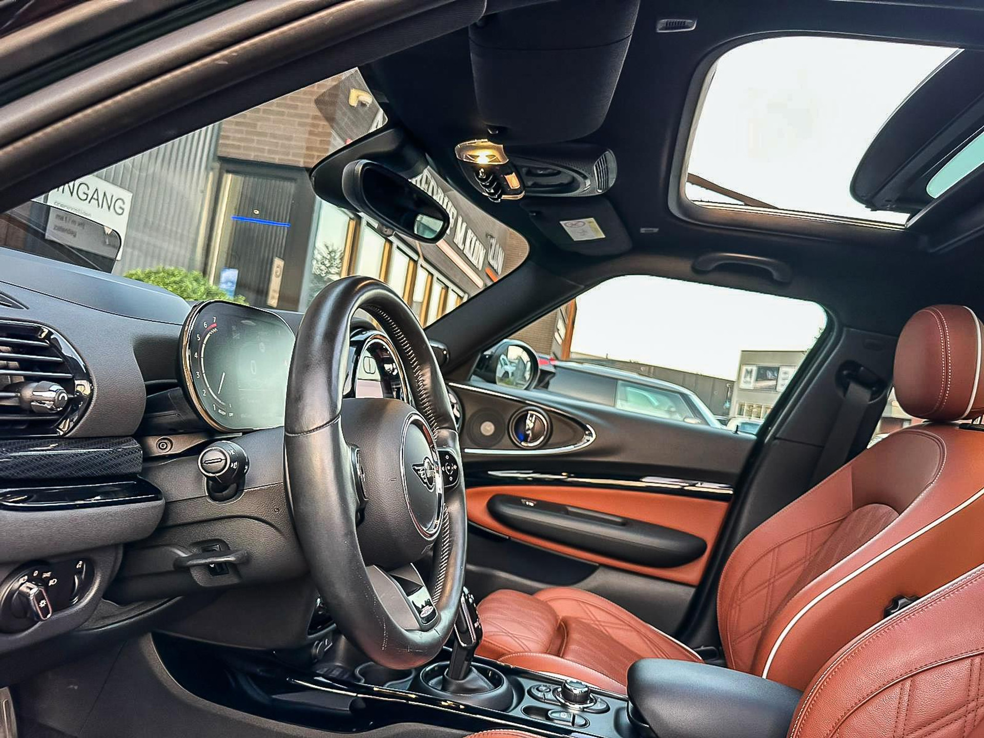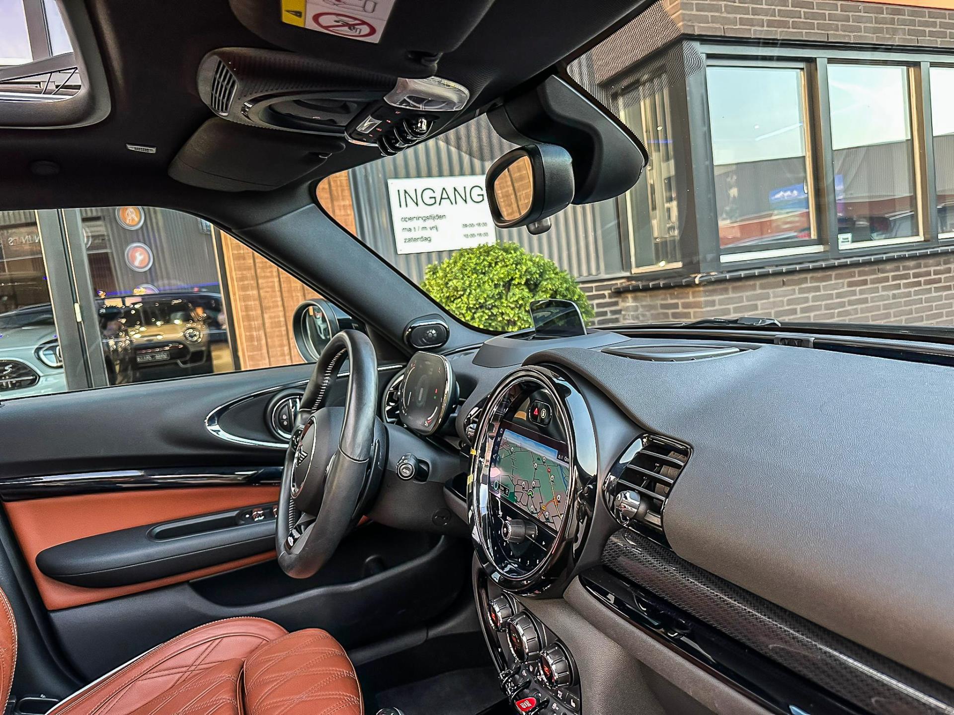 Zeer exclusieve facelift Mini Clubman John Cooper Works ALL4 F1 sportautomaat met een 306pk motor uitgevoerd in de prachtige kleurencombinatie van Rebelgreen en Chestermaltbrown lederen interieur.Deze in werkelijk nieuwstaat verkerende Mini is uitgerust met alle maar dan ook alle denkbare opties oa:Climate control,vollederen interieur Chestermalt brown,sportstoelen, stoelverwarming,verwarmd stuurwiel,virtual cockpit,breedbeeld dvd navigatie XL,Mini Connected XL,Harman Kardon soundsystem,adaptieve cruise control,keyless go,achteruitrijcamera,19” Jcw spoke velgen,head up display,sportpakket,vierwielaandrijving,led verlichting,elektrisch bedienbare glazen panoramadak,5 persoons,privacyglass,lederen Jcw sportstuur met F1 flipperschakel,lichtpakket met Mini logo's,welcome pakket,parkeersensoren voor en achter,parkassist(auto parkeert zelf in),F1 schakel op stuur,actieve voetgangersbeveiliging,dakrailing zwart,lc scherm,virtual cockpit,Mini driving modus,donker dakhemel,dakrailing zwart,mf stuur,Apple Carplay,dab radio,boordcomputer,blackline,regensensor,verwarmde voorruit,Union Jack achterlichten,vierwielaandrijving,armsteun,chili 2 pakket,alle boekjes+originele sleutels,1e eigenaar,48.000km origineel,nieuwprijs 72.500,-.Schitterende en unieke Mini Clubman Works in concoursstaat voor de echte liefhebber
