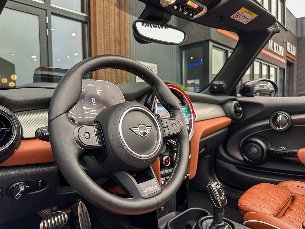 Unieke facelift Mini John Cooper Works cabrio Blackline F1 sportautomaat met een 231pk motor uitgevoerd in de prachtige kleurencombinatie van Enigmatic black metallic en Chestermalt brown lederen interieur.Deze schitterende Mini is uitgerust met alle maar dan ook alle denkbare opties:Climate control,vollederen interieur chestermalt brown,sportstoelen,stoelverwarming,verwarmd stuurwiel,virtual cockpit,breedbeeld navigatie,Mini connected XL,achteruitrijcamera,dab tuner,head up display,Harman Kardon soundsystem,tel,usb,performence control,apple carplay,Mini driving modus,elektrische cabriokap,lederen Jcw sportstuur met flipperschakel,mf stuur,automatisch dimmende binnenspiegel, regensensor,verwarmde voorruit,facelift,full Black pack, voetgangersbeveiliging,dtc,elektrisch inklapbare spiegels, parkeersensoren voor en achter,parkassist(auto parkeert zelf in),union Jack achterlichten,led koplampen met uitgebreide functies,18 inch JCW velgen circuit spoke,lichtpakket met Mini logo's,verwarmde voorruit,gezichtspakket,chili 2 pakket,55.000km origineel,nieuwprijs 63.000euro.Prachtig uitgevoerde Mini Jcw in concoursstaat voor de echte liefhebber.