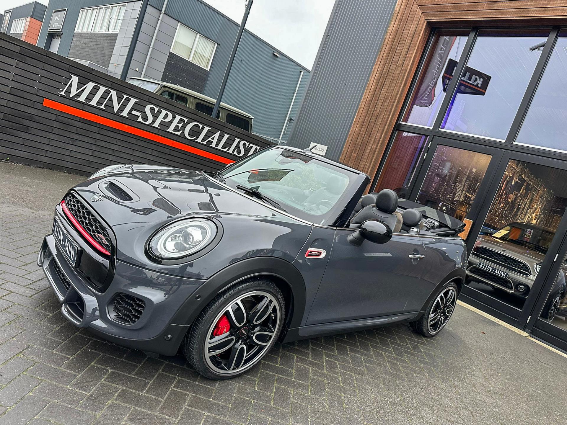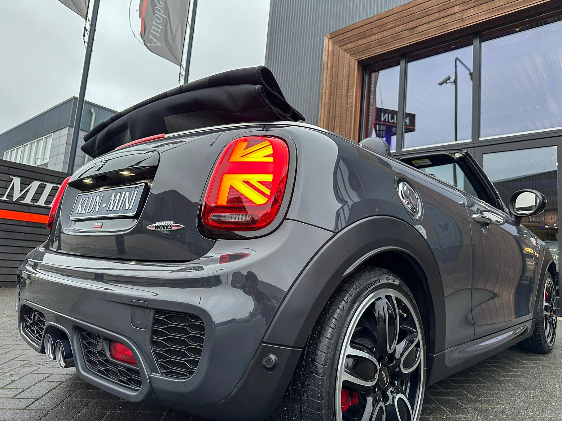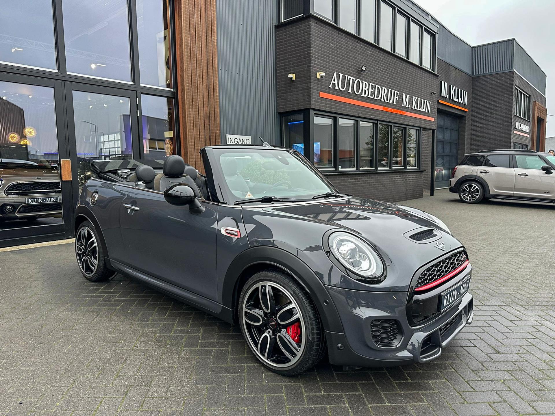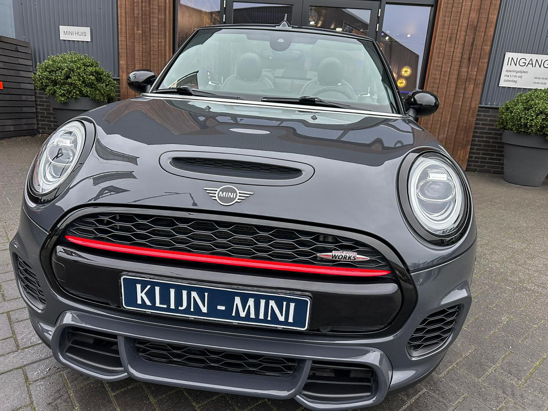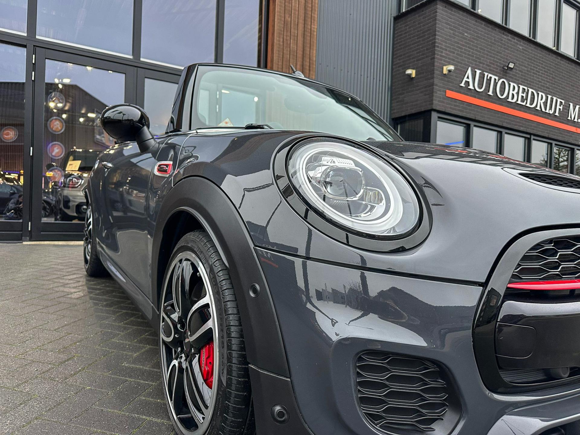 Unieke origineel Hollands geleverde Mini John Cooper Works cabrio Blackline F1 sportautomaat met een 231pk motor in de prachtige kleur Thundergrey metallic en uitgevoerd met een Union Jack cabriokap.Deze schitterende Mini is uitgerust met alle denkbare opties:Climate control,vollederen interieur carbon black,sportstoelen,stoelverwarming,breedbeeld navigatie,Mini connected XL,head up display,achteruitrijcamera,adaptieve cruise control,Harman Kardon soundsystem,dab tuner,tel,usb,performence control,apple carplay,Mini driving modus,elektrische cabriokap,Union Jack cabriokap,lederen Jcw sportstuur met flipperschakel,mf stuur,automatisch dimmende binnenspiegel,regensensor,facelift model,full black pack, voetgangersbeveiliging,dtc,elektrisch inklapbare spiegels, parkeersensoren voor en achter,parkassist(Mini parkeert zelf in),union Jack achterlichten,led koplampen met uitgebreide functies,18 inch JCW circuit spoke velgen,lichtpakket met Mini logo's,actieve cruise control,gezichtspakket,chili 2 pakket,68.000km origineel Nap,nieuwprijs 57.000euro.Prachtig uitgevoerde Mini Jcw in concoursstaat voor de echte liefhebber.