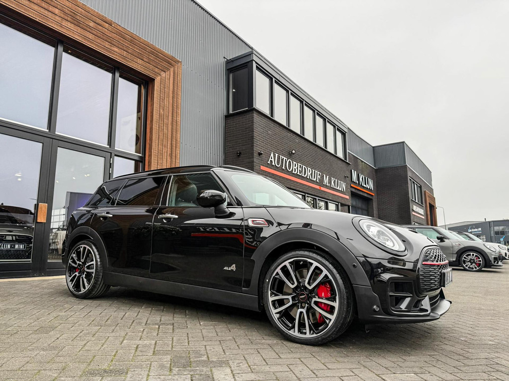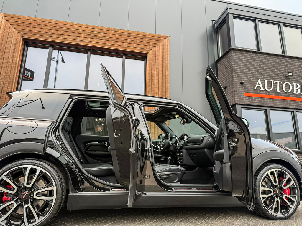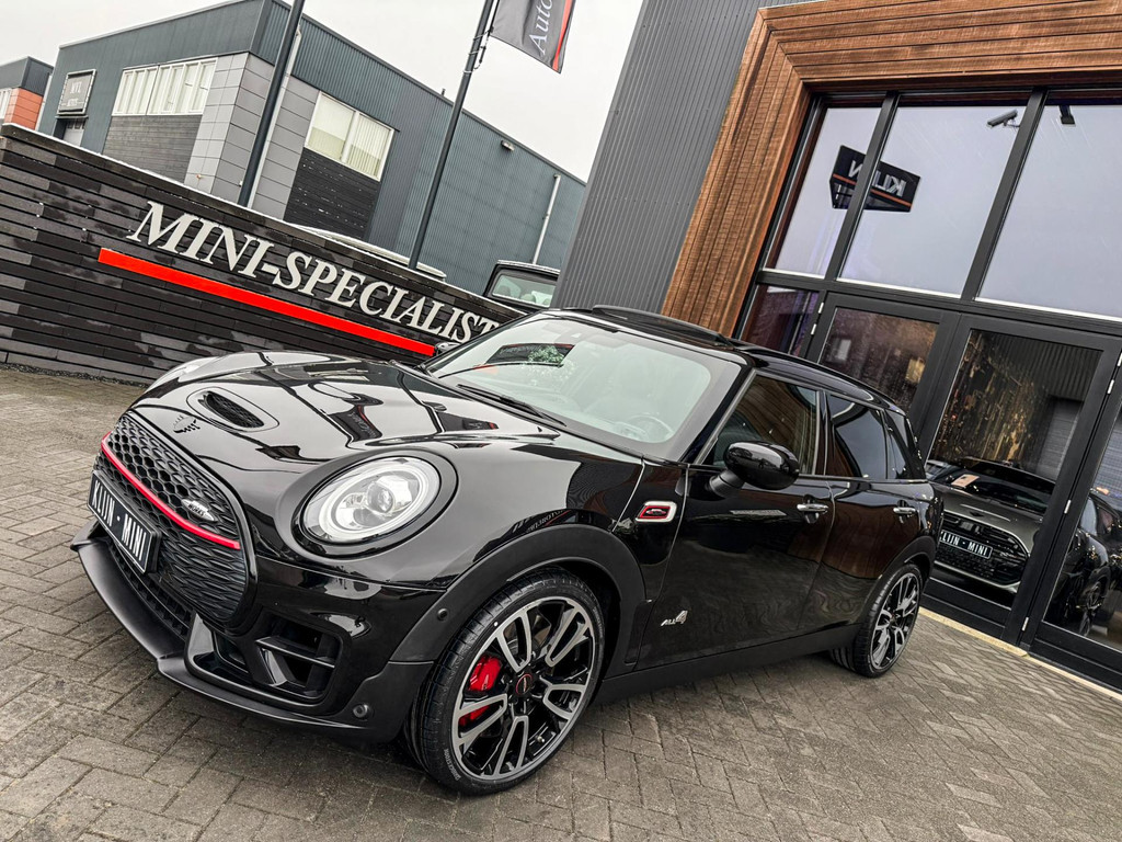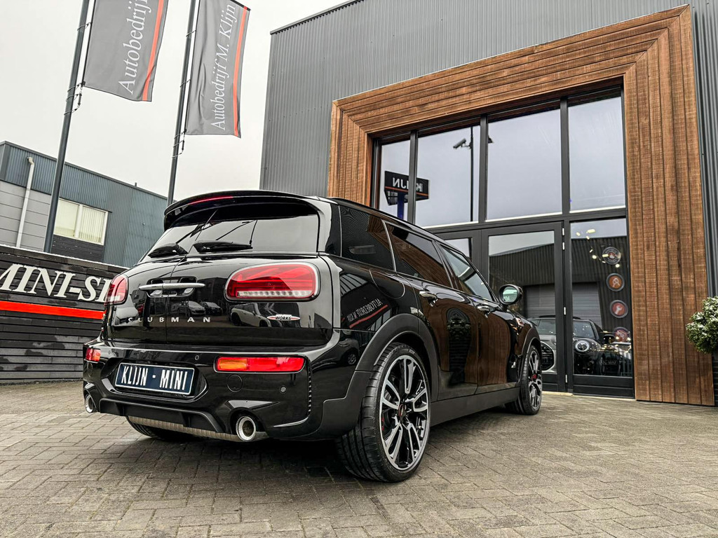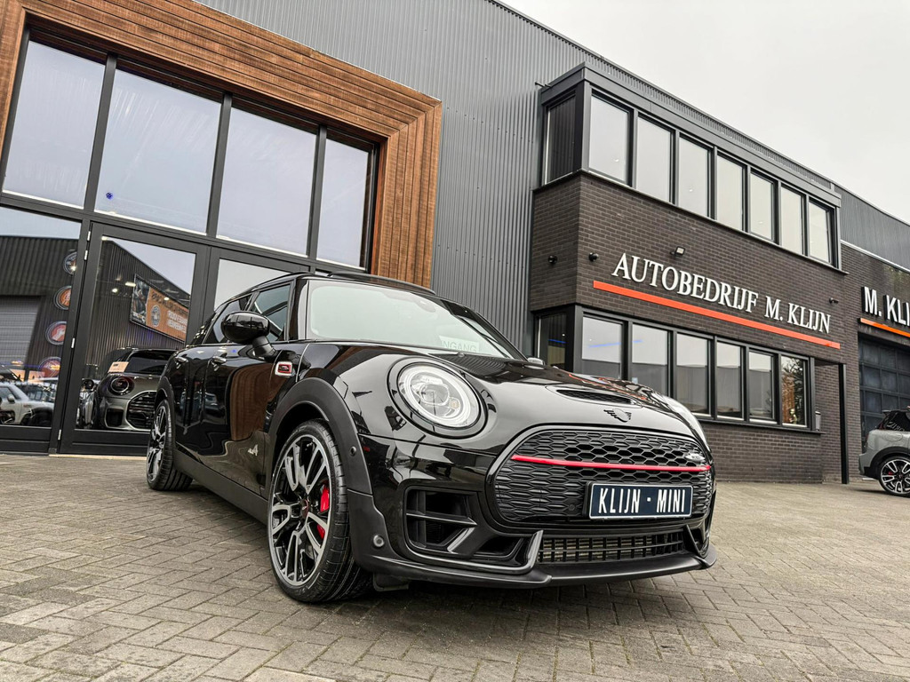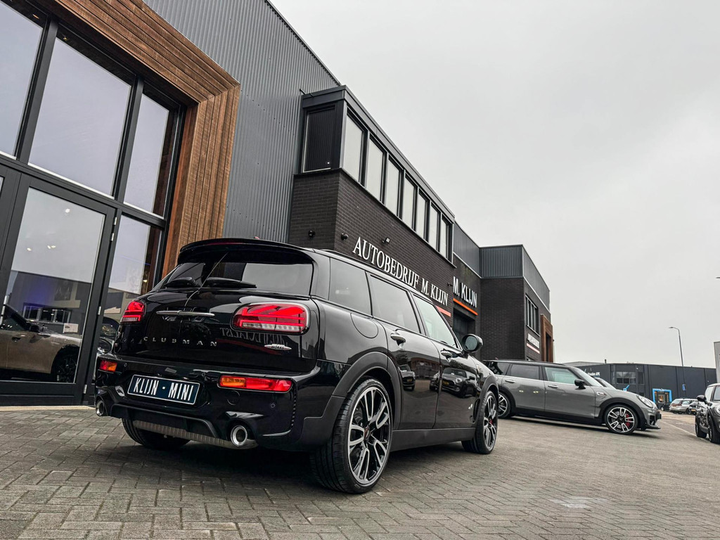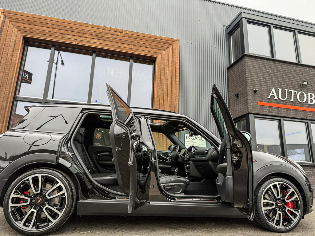 Zeer exclusieve facelift Mini Clubman John Cooper Works ALL4 F1 sportautomaat met een 306pk motor uitgevoerd in de prachtige kleur Midnightblack.Deze in werkelijk nieuwstaat verkerende Mini is uitgerust met alle maar dan ook alle denkbare opties oa:Climate control,vollederen interieur Carbon black,sportstoelen,stoelverwarming,virtual cockpit,breedbeeld dvd navigatie XL,Mini Connected XL,Harman Kardon soundsystem,head up display,adaptieve cruise control,keyless go,achteruitrijcamera,19" Jcw circuit spoke velgen,sportpakket,vierwielaandrijving,led verlichting,elektrisch bedienbare glazen panoramadak,5 persoons,privacyglass,lederen Jcw sportstuur met F1 flipperschakel,lichtpakket met Mini logo's,alarm,welcome pakket,dakrailing zwart,parkeersensoren voor en achter,parkassist(auto parkeert zelf in),F1 schakel op stuur,actieve voetgangersbeveiliging,lc scherm,virtual cockpit,Mini driving modus,donker dakhemel,mf stuur,Apple Carplay,dab radio,boordcomputer,blackline,regensensor,verwarmde voorruit,Union Jack achterlichten,vierwielaandrijving,armsteun,chili 2 pakket,alle boekjes+originele sleutels,Btw auto,1e eigenaar,85.000km origineel,nieuwprijs 71.900,-.Schitterende en unieke Mini Clubman Works in concoursstaat voor de echte liefhebber