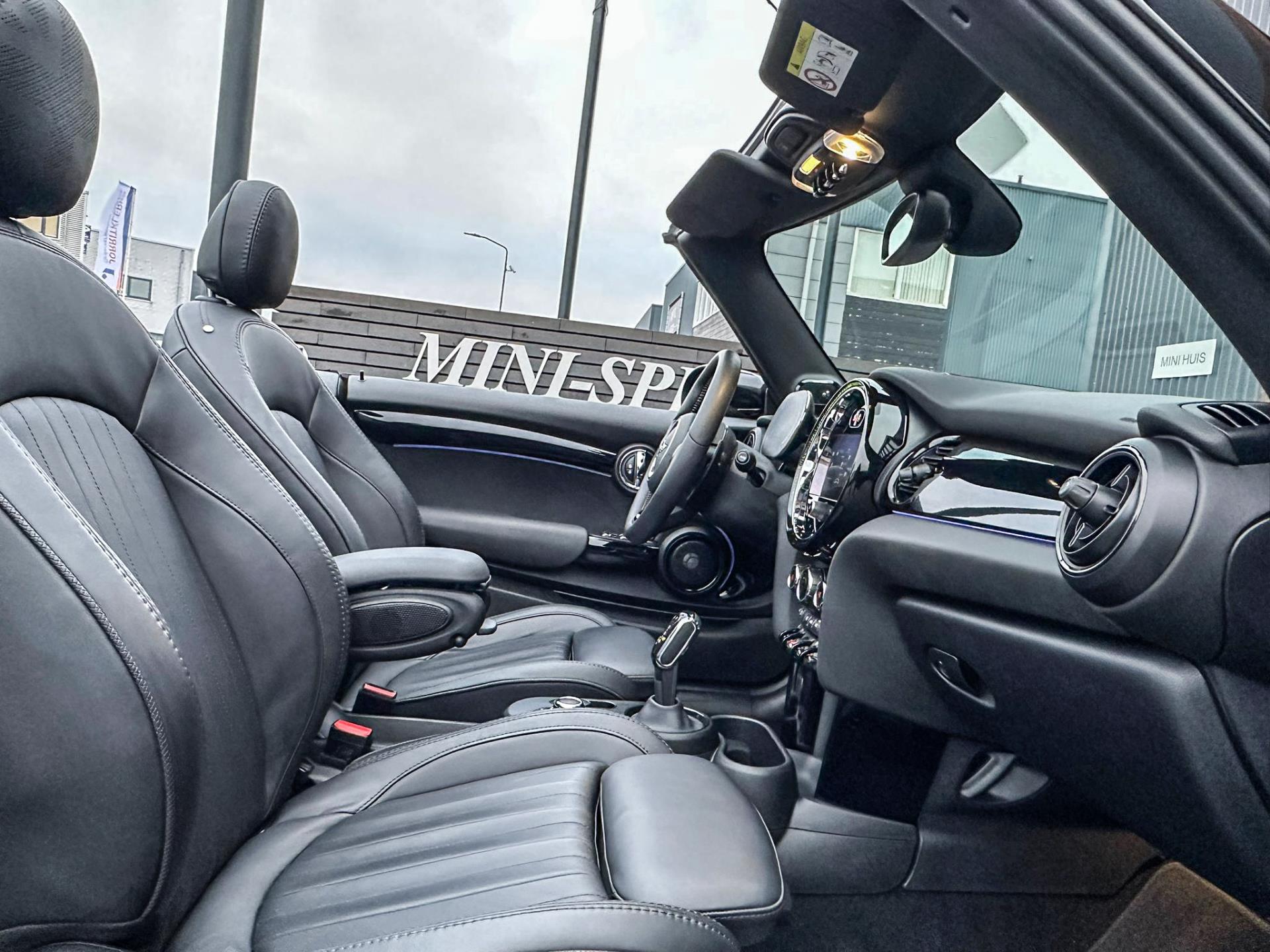 Unieke Mini John Cooper Works cabrio Blackline F1 sportautomaat met een 231pk motor in de prachtige kleur Midnightblack black metallic.Deze schitterende Mini is uitgerust met alle maar dan ook alle denkbare opties:Climate control,vollederen interieur Yours lounge,sportstoelen,stoelverwarming,stuurwiel verwarmd,digitaal dashbord,breedbeeld navigatie,Mini connected XL,head up display,Harman Kardon soundsystem,achteruitrijcamera,adaptieve cruise control,dab tuner,tel,usb,performence control,apple carplay,Mini driving modus,elektrische cabriokap,lederen Jcw sportstuur met flipperschakel,mf stuur,automatisch dimmende binnenspiegel, regensensor,verwarmde voorruit,facelift,full blackpack, voetgangersbeveiliging,dtc,elektrisch inklapbare spiegels, parkeersensoren voor en achter,parkassist(Mini parkeert zelf in),union Jack achterlichten,led koplampen met uitgebreide functies,18 inch JCW velgen circuit spoke,lichtpakket met Mini logo's,actieve cruise control,gezichtspakket,chili 2 pakket,19.000km origineel,nieuwprijs 63.000euro.Prachtig uitgevoerde Mini Jcw in concoursstaat voor de echte liefhebber.