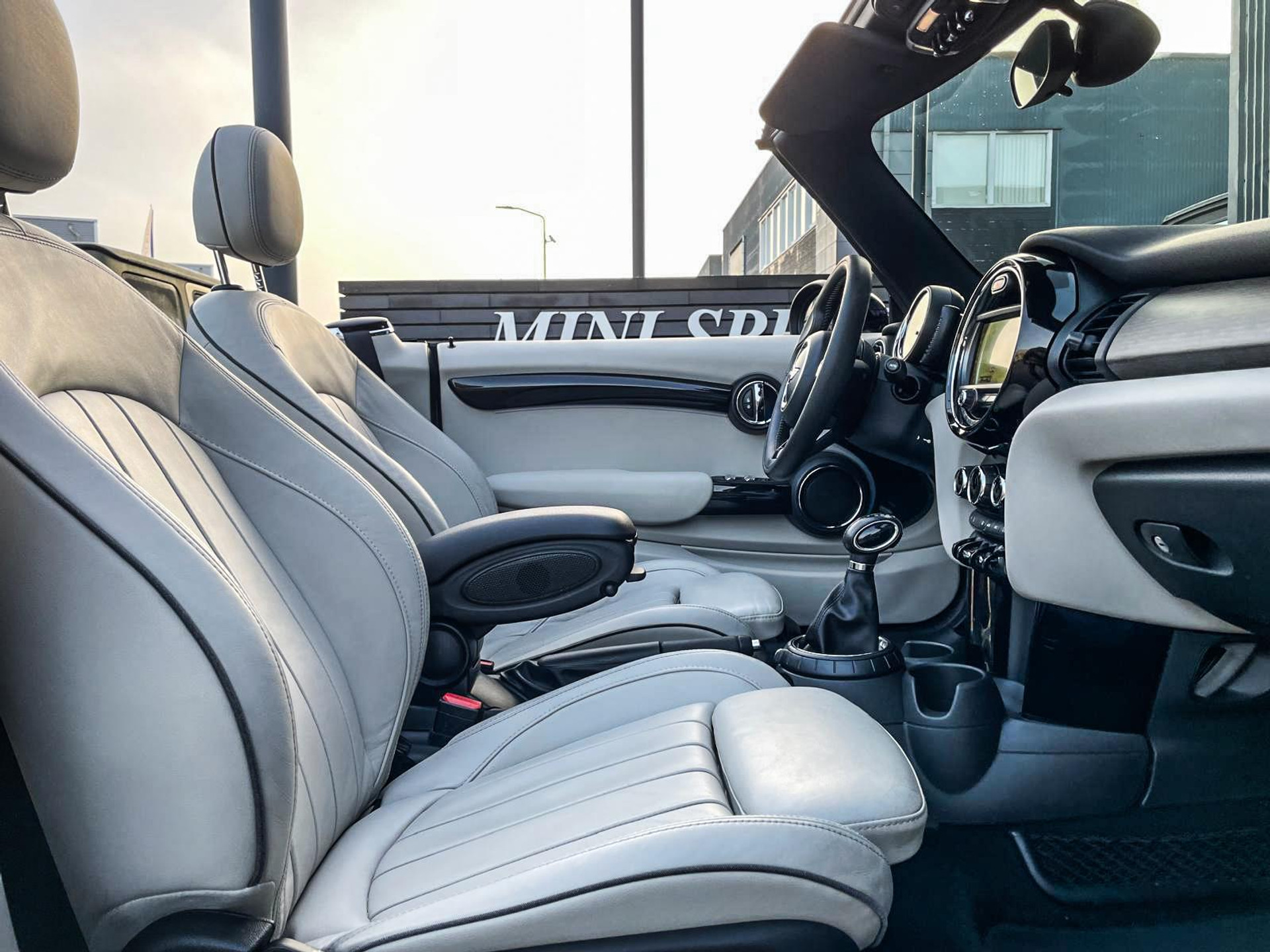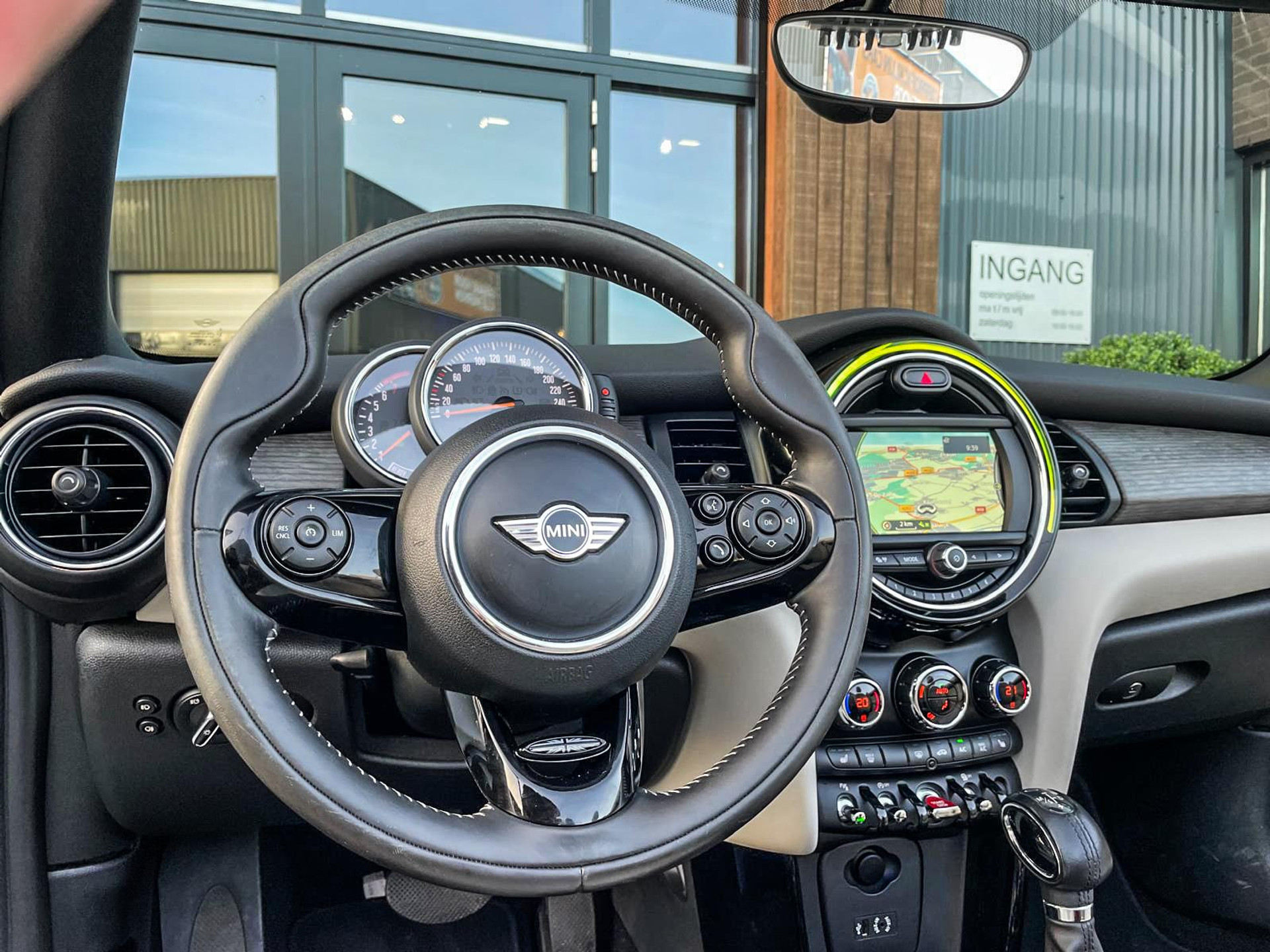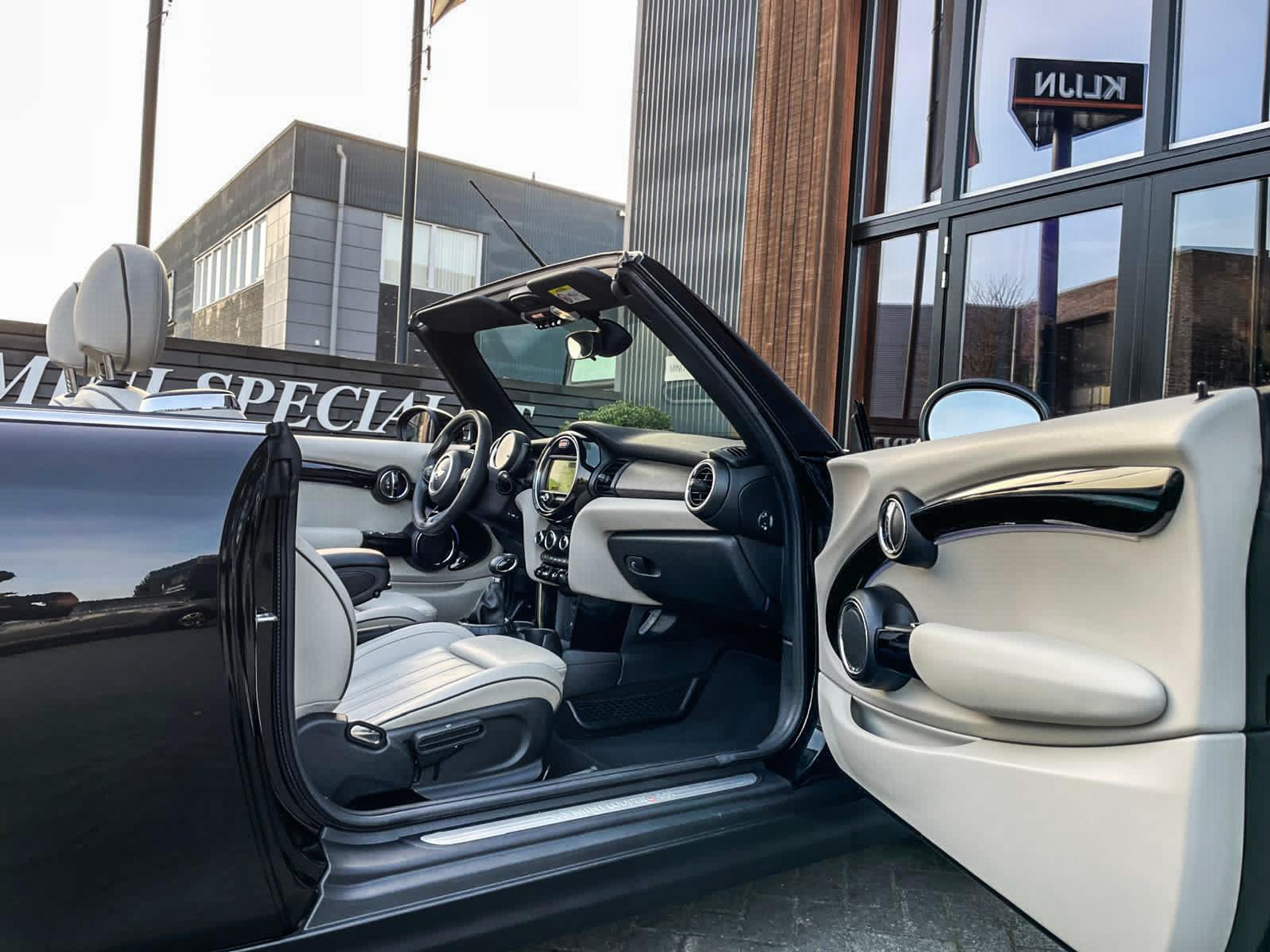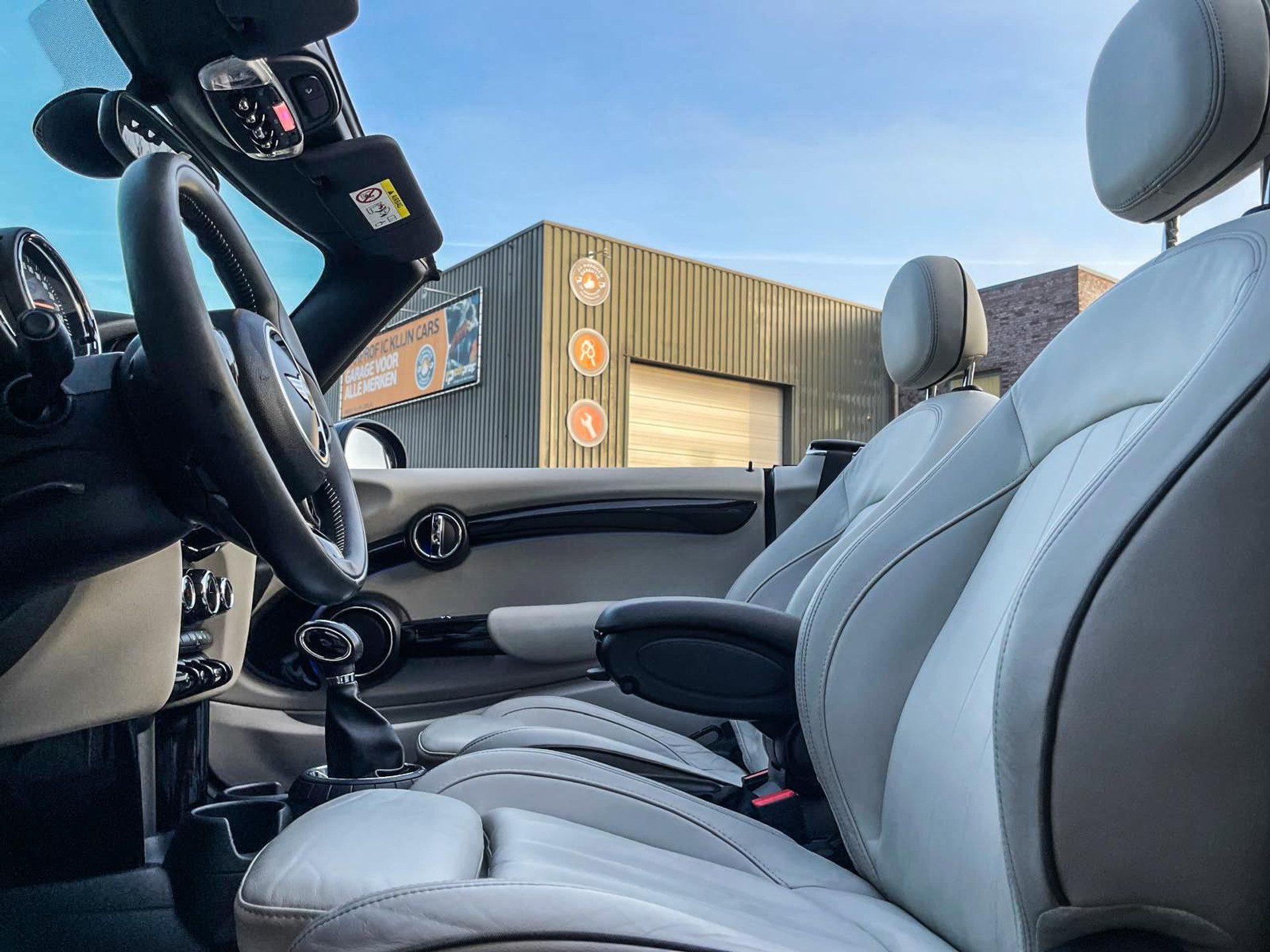 Unieke Mini Cooper Chili S automaat met een 192pk motor uitgevoerd in de prachtige kleurencombinatie van Midnightblack metallic en Satellite grey lederen interieur.Deze schitterende Mini en in werkelijk nieuwstaat verkerende Mini is uitgerust met vele opties oa:Volautomatische airco,vollederen interieur Satellite grey,sportstoelen,stoelverwarming,navigatie,Mini connected,tel,achteruitrijcamera,usb,Mini driving modus,elektrische cabriokap Union Jack,lederen sportstuur,mf stuur,regensensor, voetgangersbeveiliging,cruise control,parkeersensoren voor en achter,parkassist(Mini parkeert zelf im),armsteun,Union Jack achterlichten,led verlichting,18 inch Mini Yours Masterpiece velgen,lichtpakket,gezichtspakket,50.000km origineel.Prachtig uitgevoerde Mini cabrio in concoursstaat voor de echte liefhebber.