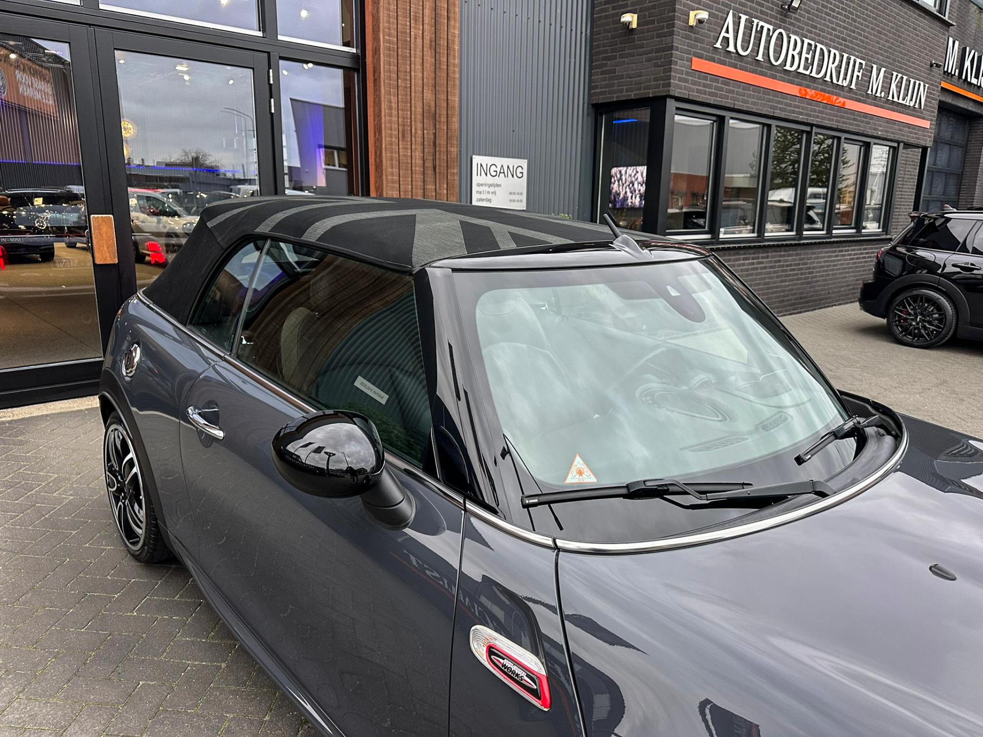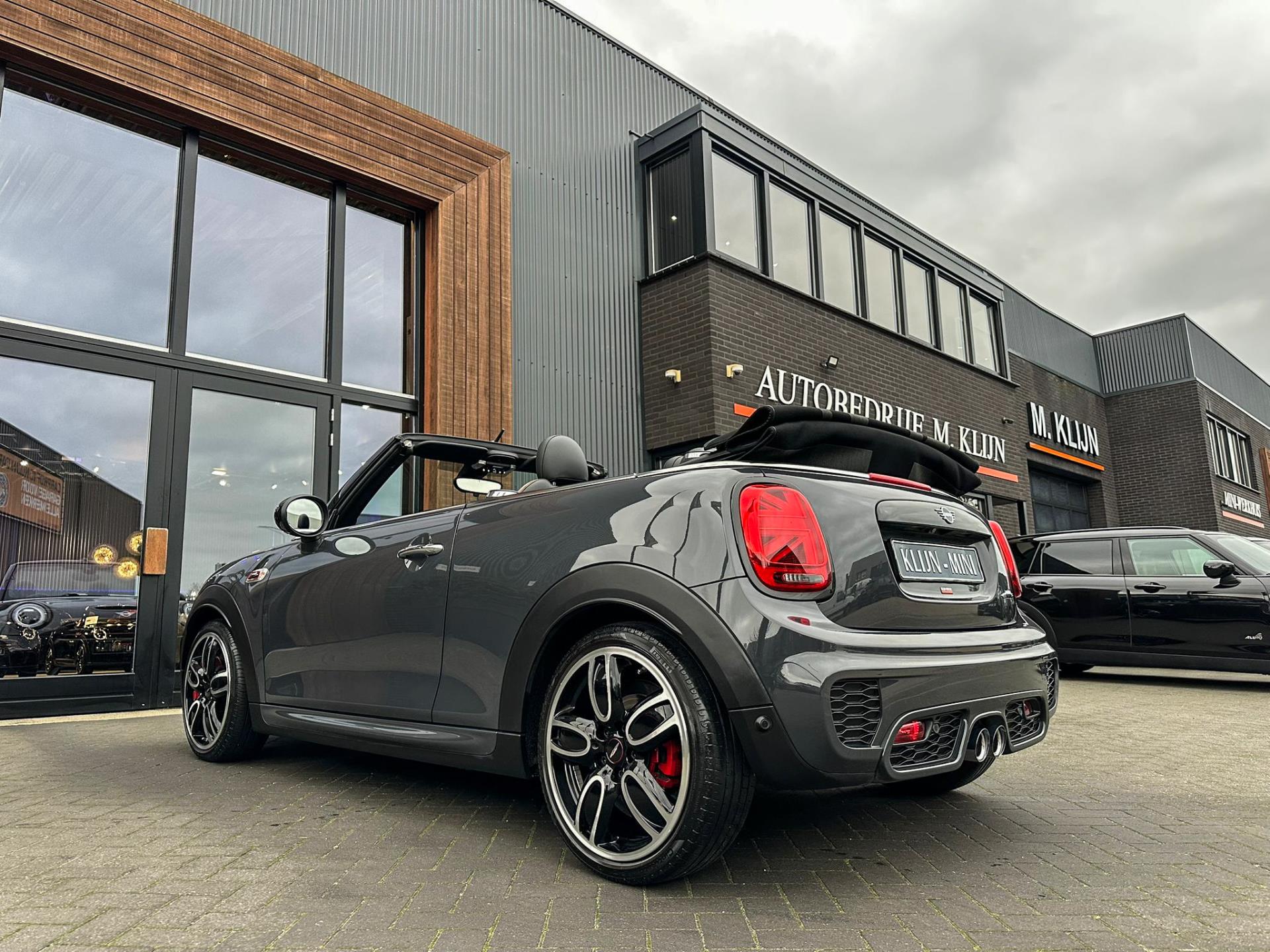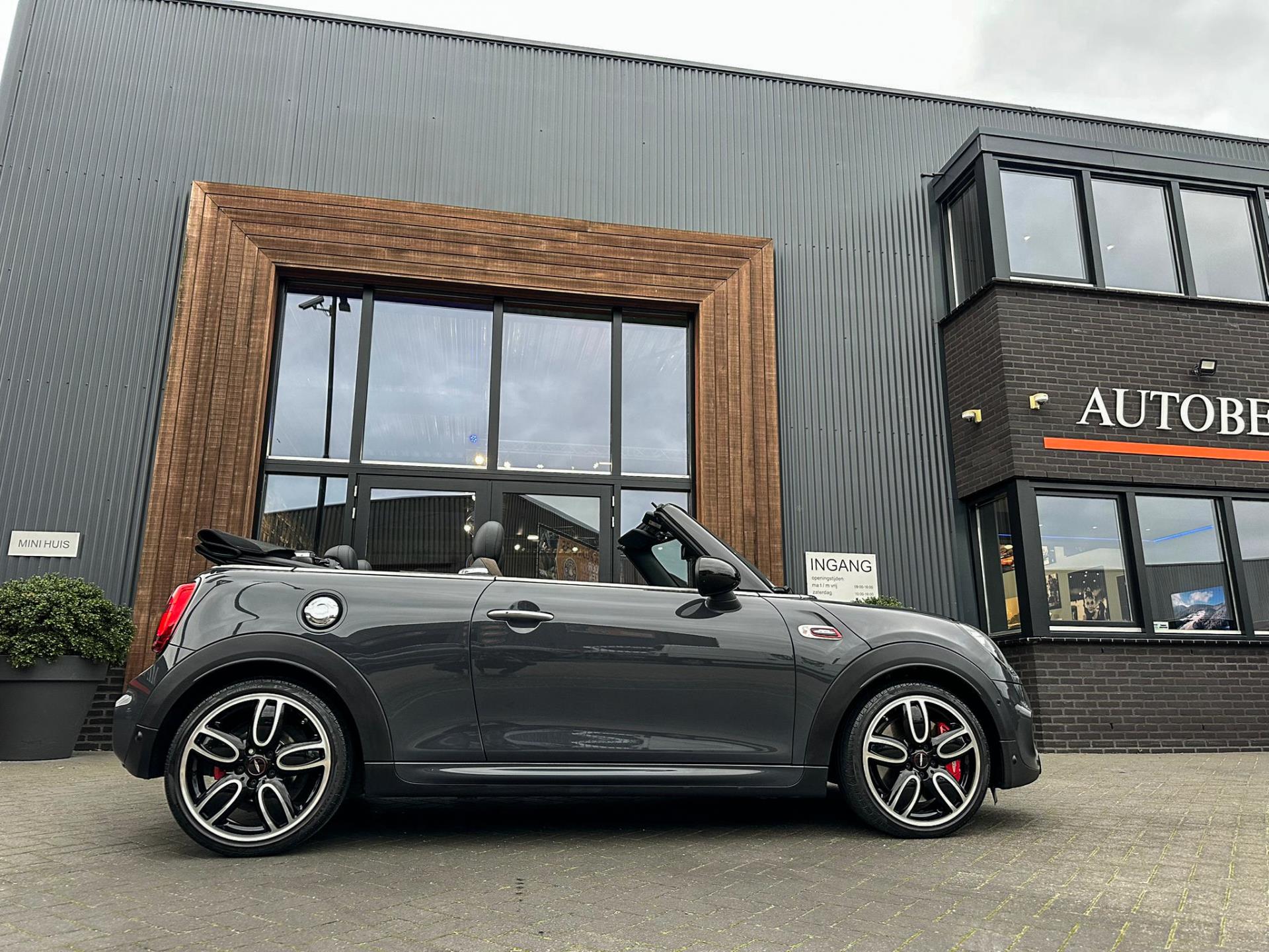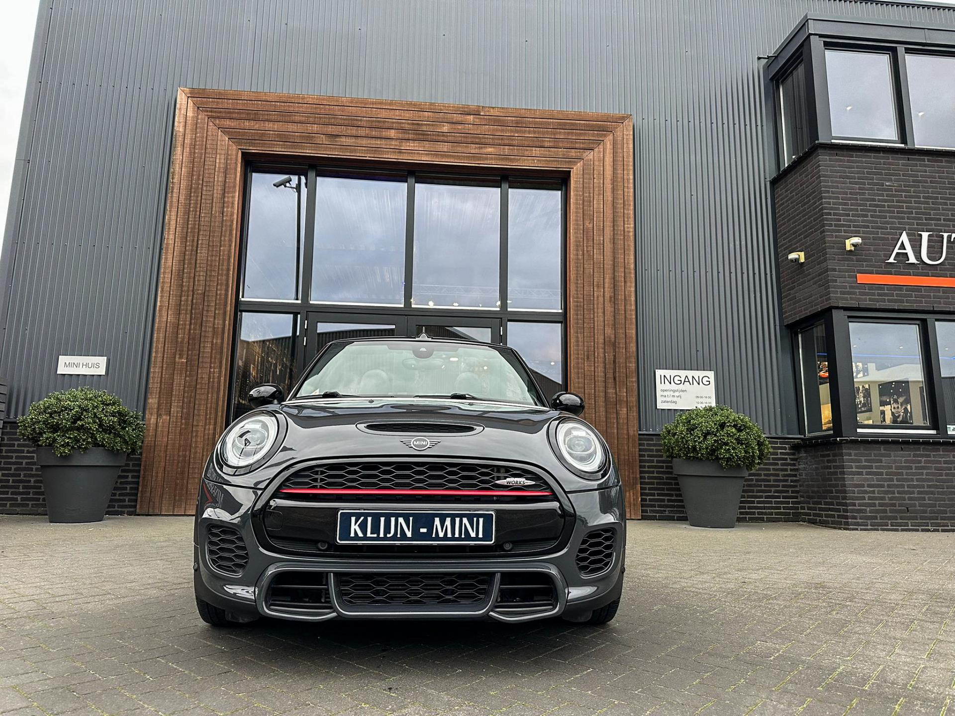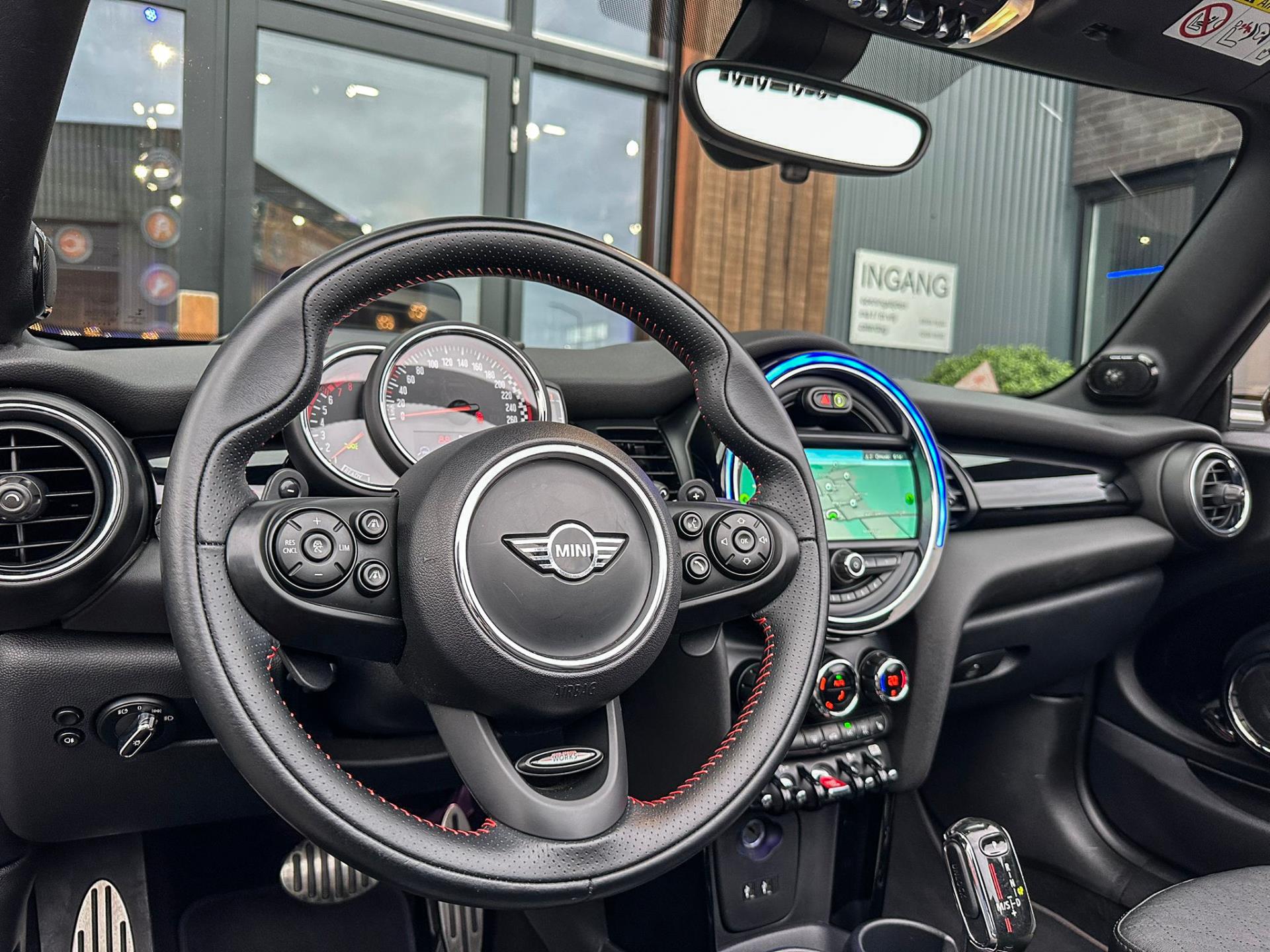 Unieke origineel Hollands geleverde Mini John Cooper Works cabrio Blackline F1 sportautomaat met een 231pk motor in de prachtige kleur Thundergrey metallic en uitgevoerd met een Union Jack cabriokap.Deze schitterende Mini is uitgerust met alle denkbare opties:Climate control,vollederen interieur carbon black,sportstoelen,stoelverwarming,breedbeeld navigatie,Mini connected XL,head up display,achteruitrijcamera,adaptieve cruise control,Harman Kardon soundsystem,dab tuner,tel,usb,performence control,apple carplay,Mini driving modus,elektrische cabriokap,Union Jack cabriokap,lederen Jcw sportstuur met flipperschakel,mf stuur,automatisch dimmende binnenspiegel,regensensor,facelift model,full black pack, voetgangersbeveiliging,dtc,elektrisch inklapbare spiegels, parkeersensoren voor en achter,parkassist(Mini parkeert zelf in),union Jack achterlichten,led koplampen met uitgebreide functies,18 inch JCW circuit spoke velgen,lichtpakket met Mini logo's,actieve cruise control,gezichtspakket,chili 2 pakket,68.000km origineel Nap,nieuwprijs 57.000euro.Prachtig uitgevoerde Mini Jcw in concoursstaat voor de echte liefhebber.
