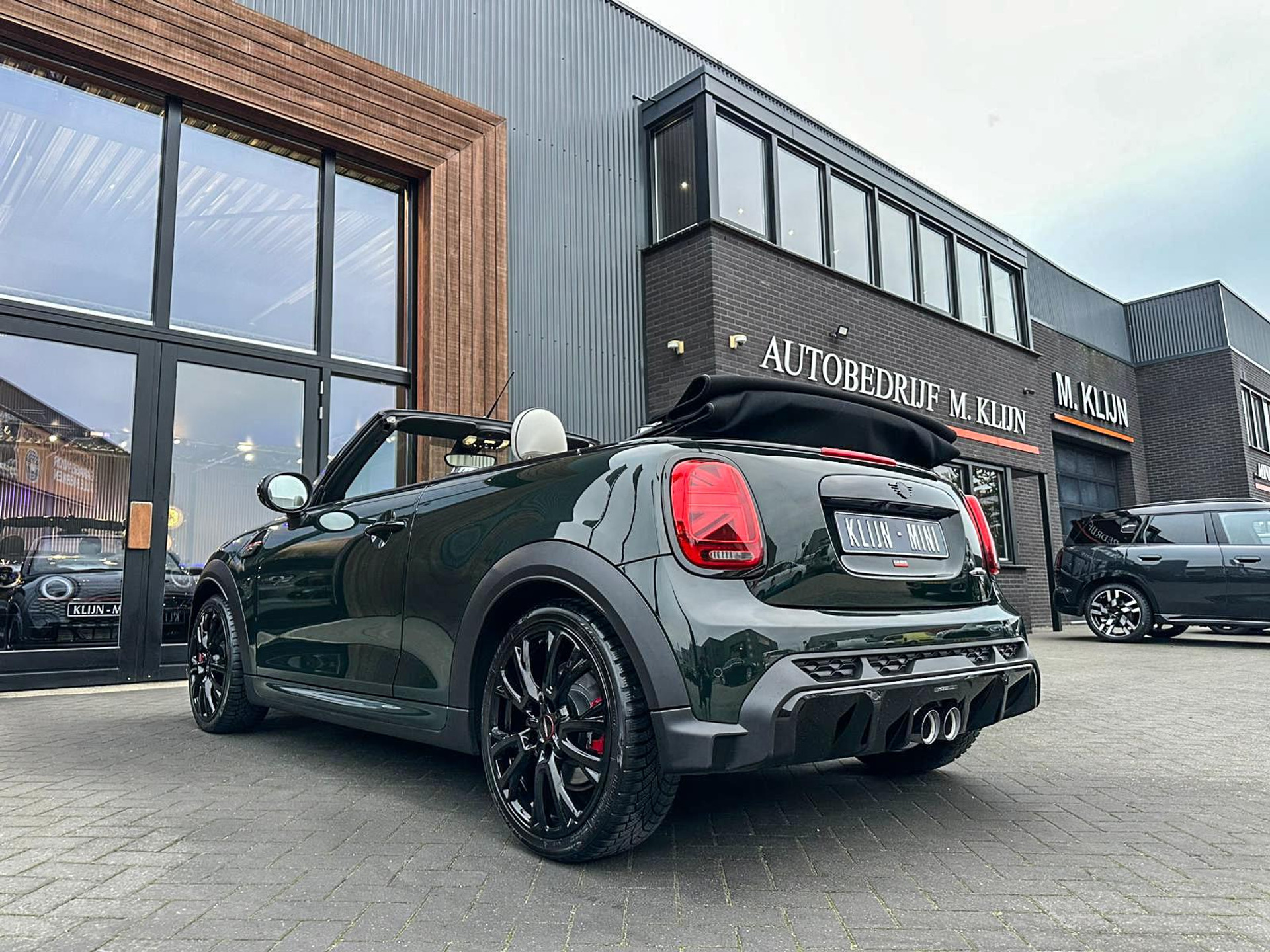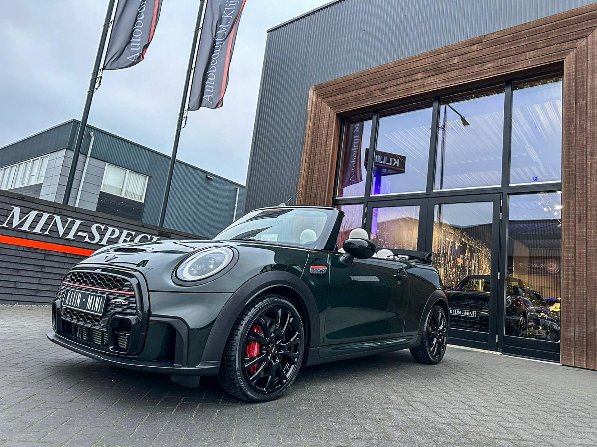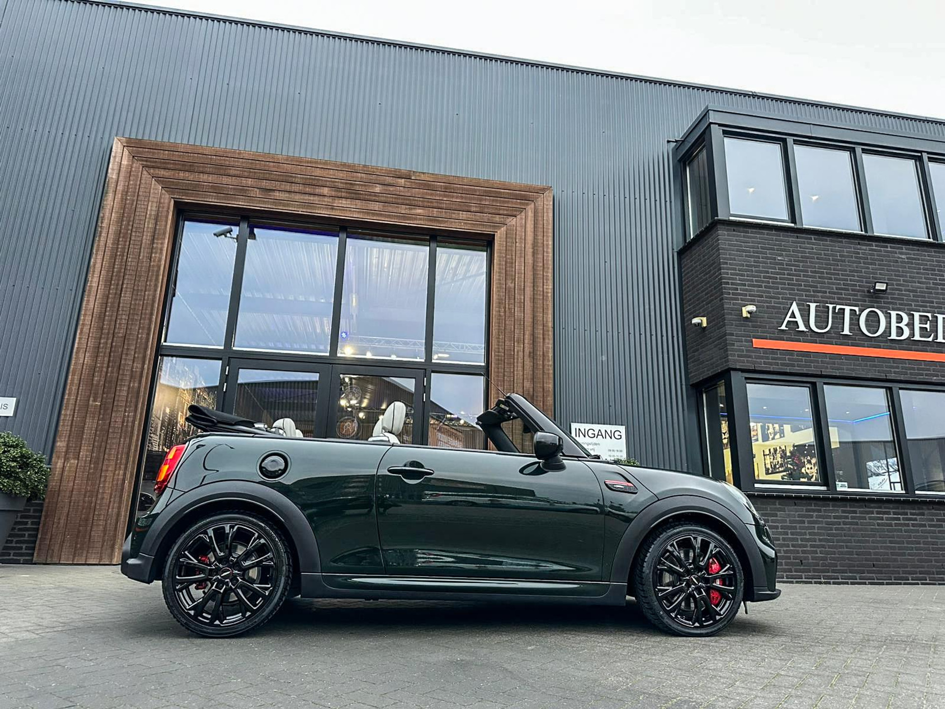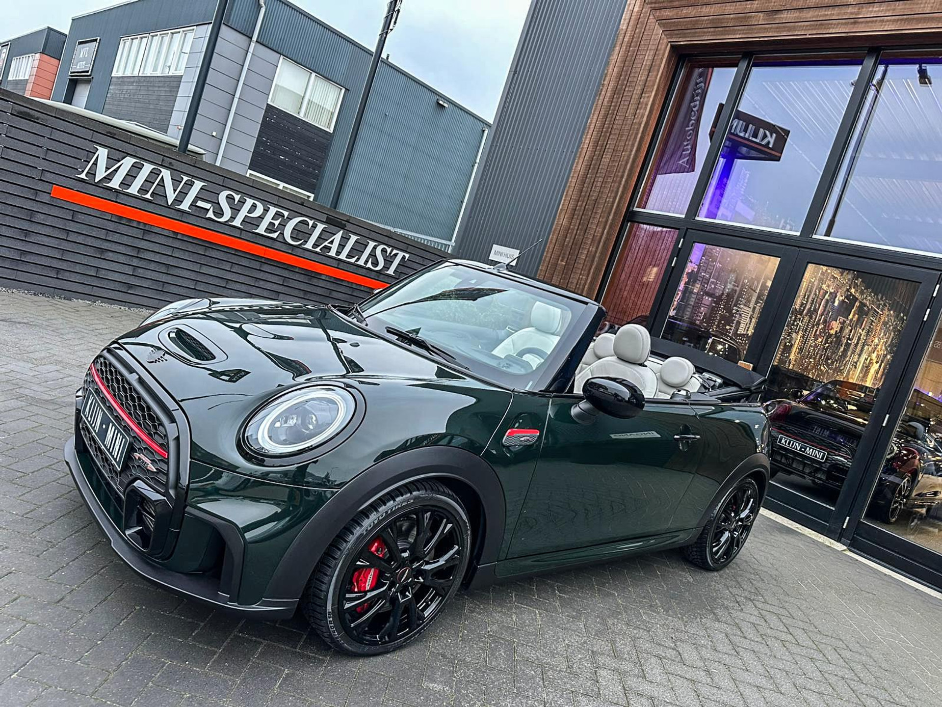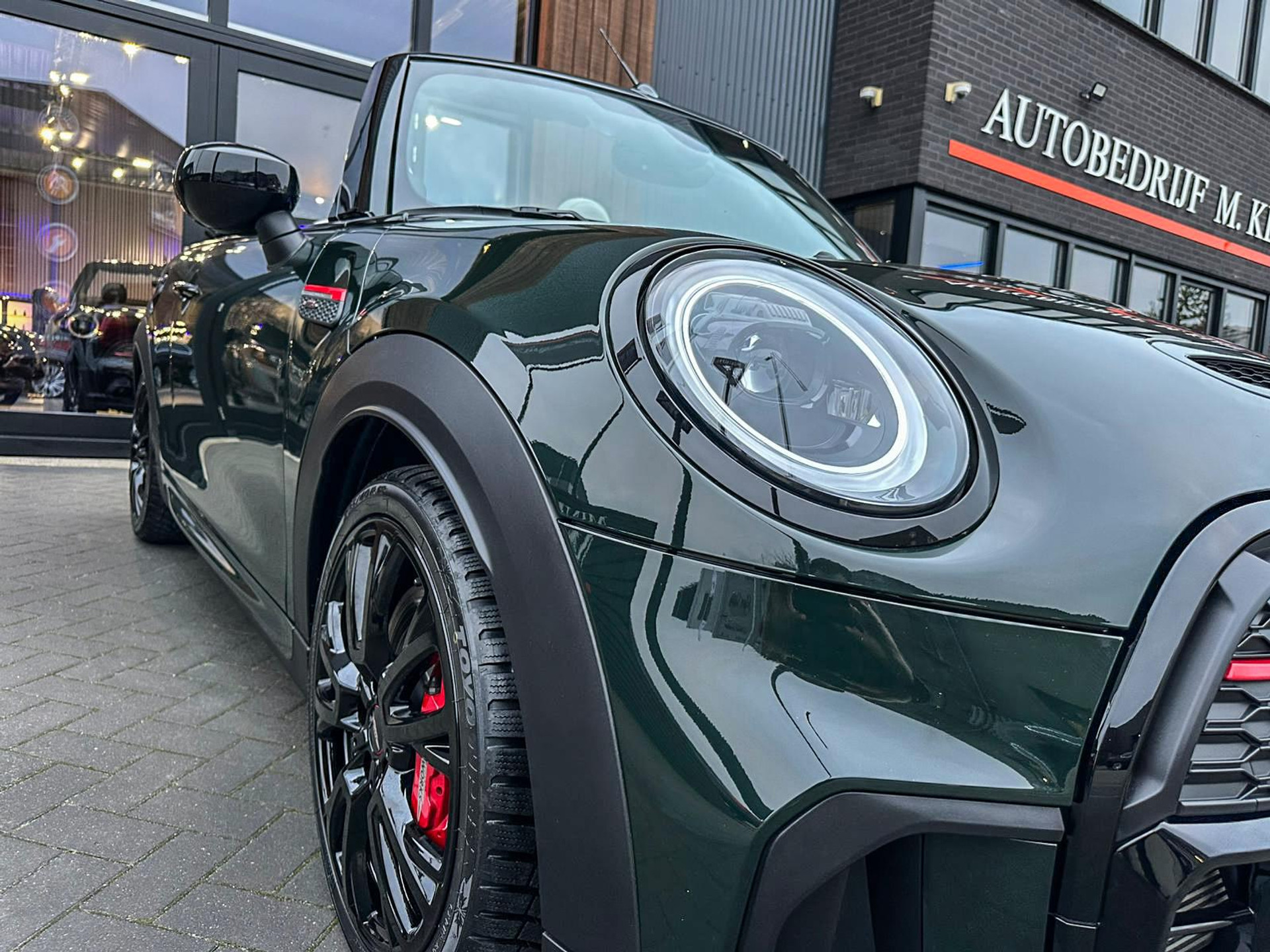 Unieke Mini John Cooper Works cabrio Blackline F1 sportautomaat met een 231pk motor uitgevoerd in de prachtige kleurencombinatie van Rebelgreen en Chester Satelitte grey lederen interieur.Deze schitterende Mini is uitgerust met alle maar dan ook alle denkbare opties:Climate control,vollederen interieur chester Satelitte grey,sportstoelen,stoelverwarming,verwarmd stuurwiel,virtual cockpit,breedbeeld navigatie,Mini connected XL,achteruitrijcamera,dab tuner,head up display,Harman Kardon soundsystem,adaptieve cruise control,tel,usb,performence control,apple carplay,Mini driving modus,elektrische cabriokap,lederen Jcw sportstuur met flipperschakel,mf stuur,automatisch dimmende binnenspiegel,regensensor,verwarmde voorruit,facelift,full Black pack, voetgangersbeveiliging,dtc,elektrisch inklapbare spiegels, parkeersensoren,union Jack achterlichten,led koplampen met uitgebreide functies,18 inch JCW velgen circuit spoke,lichtpakket met Mini logo's,gezichtspakket,chili 2 pakket,22.000km origineel,Btw auto,nieuwprijs 63.000euro.Prachtig uitgevoerde Mini Jcw in concoursstaat voor de echte liefhebber.