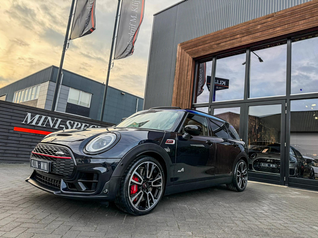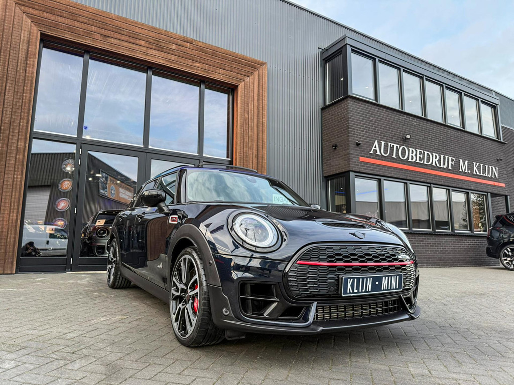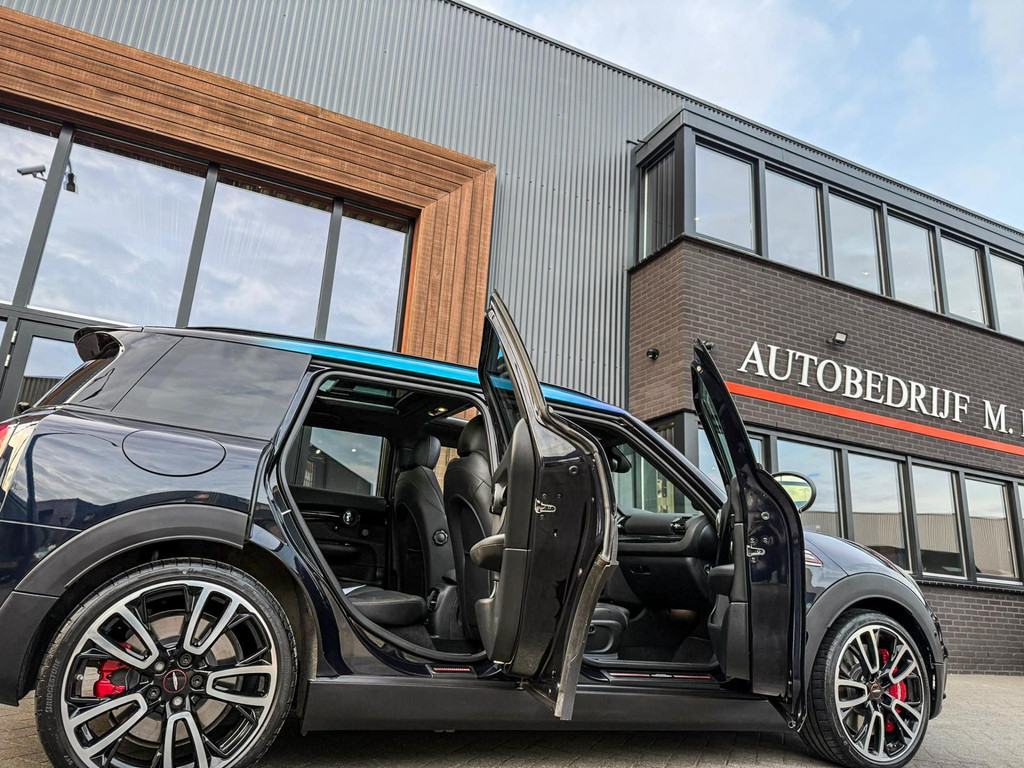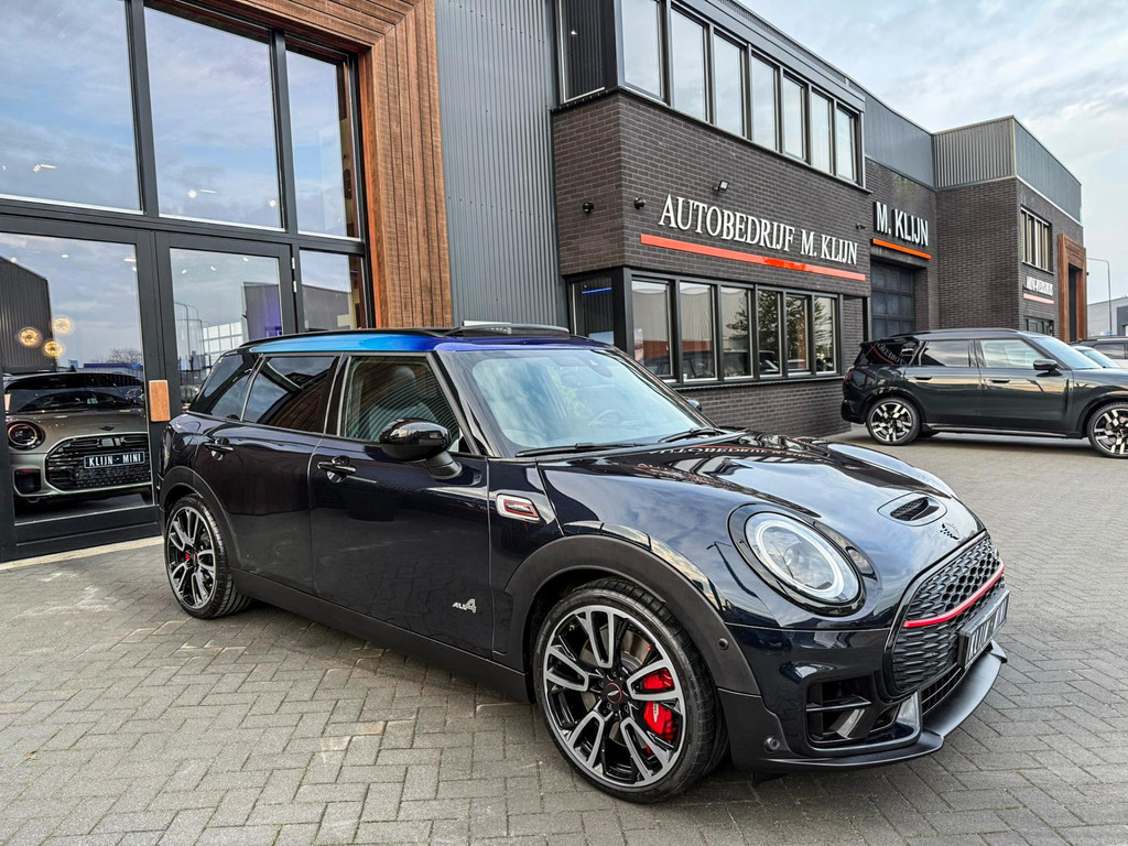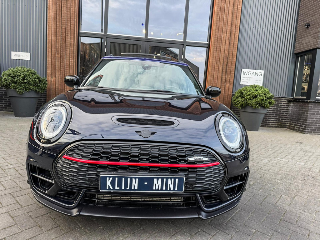 Zeer exclusieve facelift(nieuwste model) Mini Clubman John Cooper Works ALL4 F1 sportautomaat met een 306pk motor uitgevoerd in de prachtige kleur Enigmatic black.Deze in werkelijk nieuwstaat verkerende Mini is voorzien van een multitone dak vanaf fabriek en uitgerust met alle denkbare opties oa:Climate control,vollederen interieur Carbon Black,sportstoelen, stoelverwarming,verwarmd stuurwiel,virtual cockpit,breedbeeld dvd navigatie XL,Mini Connected XL,keyless go,achteruitrijcamera,19” Jcw cup velgen,head up display,Harman Kardon soundsystem,sportpakket,vierwielaandrijving,led verlichting,elektrisch bedienbare glazen panoramadak,5 persoons,privacyglass,multitone dak origineel vanaf fabriek,lederen Jcw sportstuur met F1 flipperschakel,lichtpakket met Mini logo's,welcome pakket,parkeersensoren voor en achter,parkassist(auto parkeert zelf in),F1 schakel op stuur,actieve voetgangersbeveiliging,dakrailing zwart,lc scherm,Mini driving modus,donker dakhemel,mf stuur,Apple Carplay,dab radio,boordcomputer,blackline,nieuw model,regensensor,verwarmde voorruit,Union Jack achterlichten,vierwielaandrijving,armsteun,chili 2 pakket,alle boekjes+originele sleutels,1e eigenaar,58.000km origineel,Btw auto,nieuwprijs 72.200,-.Schitterende en unieke Mini Clubman Works in concoursstaat voor de echte liefhebber.